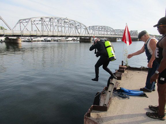 The divers were then helped to the dive ladder and they descended into the murky depths of Sturgeon Bay.