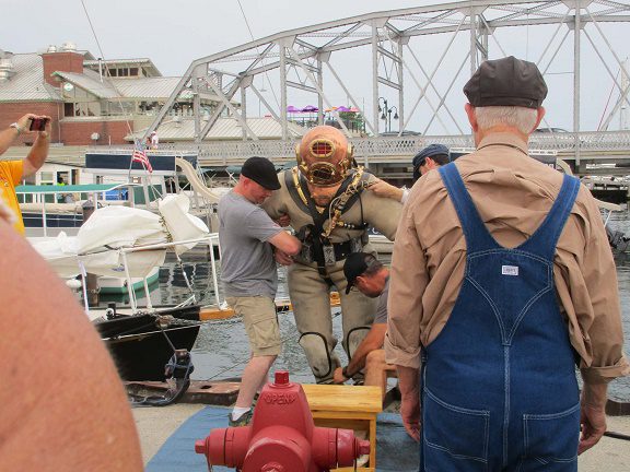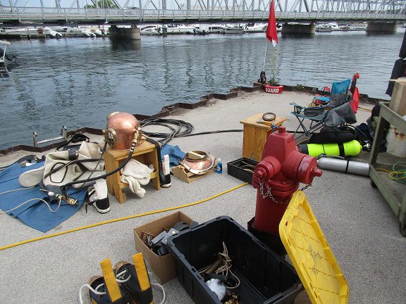 In a concession to modernity, LMCDO president Trevor Pinkalla used modern SCUBA equipment to check out the bottom of the Lake at the dock of the Door County Maritime Museum in Sturgeon Bay WI prior to dive activities.
