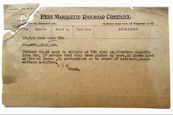 Telegram reports sinking of PERE MARQUETTE 18