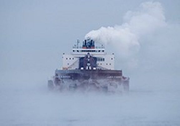 Tom Wenstadt, our Door County correspondent, reports that the M/V JAMES R. BARKER arrived midday at the mouth of Sturgeon Bay Monday, January 20th after a long battle with ice on the bay of Green Bay the previous night. The BARKER pivoted and backed to within 2 miles of the Fincantieri Bay Shipbuilding yard with assistance by the tugs DONALD J. SARTER, JIMMIE L. as well as the USCGC MACKINAW. After spending the night of the 21st, the vessel docked at the Fincantieri Bay Shipbuilding yard early this morning for winter storage.