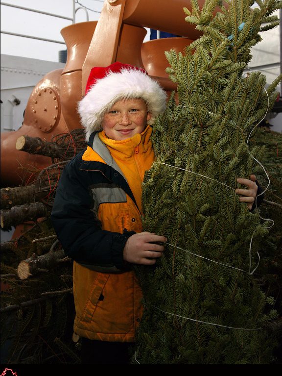 A young volunteer helps deliver Christmas trees to Chicago harbor aboard the latter-day “Christmas Tree Ship,” icebreaker Mackinaw WAGB 83, December 2005.