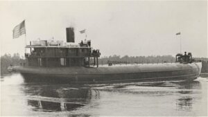 The tug OLIVE L. MOORE was built in 1928 at Manitowoc by the Manitowoc Shipbuilding Co. as the JOHN F. CUSHING, measuring 120.2 feet long, 27.1 feet in beam, and 13.8 feet deep. She was renamed JAMES E. SKELLY in 1965 and OLIVE L. MOORE in 1966. She is currently owned by Grand River Navigation.
