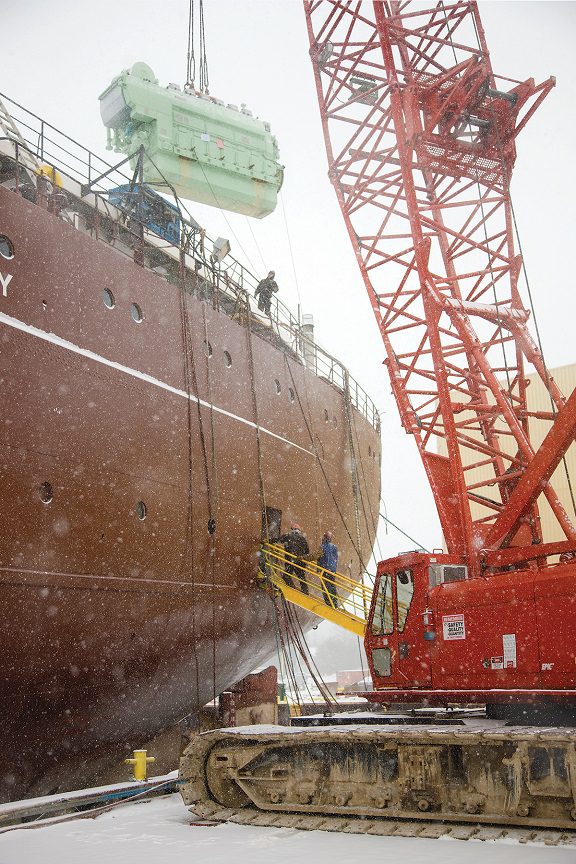 Fincantieri Bay Shipbuilding’s “Triple Eight” crawler crane lifts one of the CHARLES M. BEEGHLY‘s new dual-fuel MaK powerplants into the vessel’s engine well, January 2009.