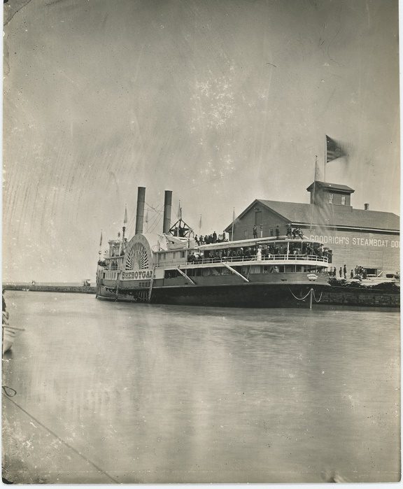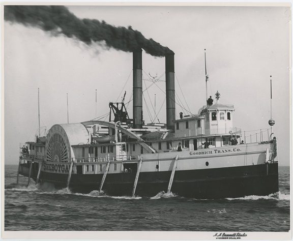 “Manitowoc, Wis., Sept. 26 – After forty-five years of service on Lake Michigan, the Goodrich line steamer SHEBOYGAN, the first boat built by that company, was towed a mile north of the harbor piers Friday night and burned amid great ceremonies. President Goodrich, General Manager Thorp and a party from Chicago were here for the “funeral” of their pioneer craft.