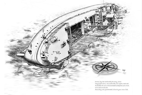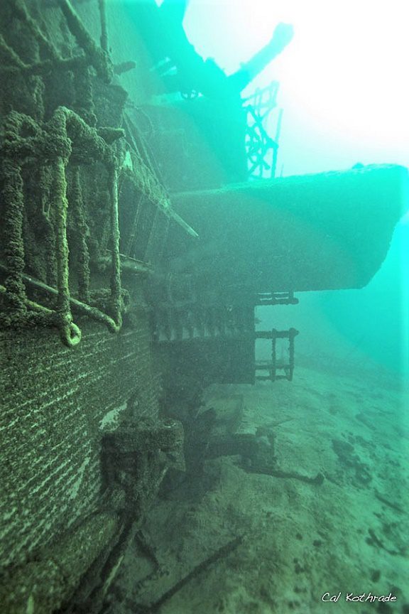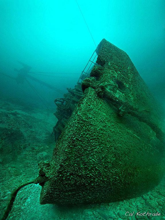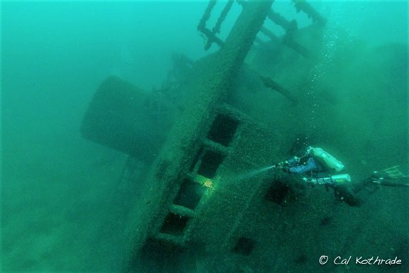 PHOTO CREDIT:  Above water – Great Lakes Marine Collection of the Milwaukee Public Library and Wisconsin Marine Historical Society.  Below water – Cal Kothrade is the Shipwreck Ambassador of the Wisconsin Marine Historical Society, a diver, a photographer and an artist.  His work can be viewed at www.calsworld.net