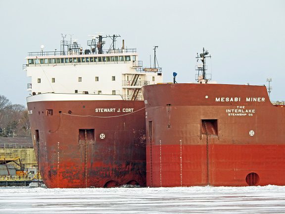 Tom Wenstadt, our Door County correspondent, reports that the M/V STEWART J. CORT arrived at the Fincantieri Bay Shipbuilding yard, Thursday, January 16th. The vessel pivoted at the mouth of Sturgeon Bay, then backed the six miles up the Sturgeon Bay channel to the yard. It then backed into the slip adjacent to the MESABI MINER. The CORT was assisted in these maneuvers by tugs JIMMIE L and DONALD J SARTER.