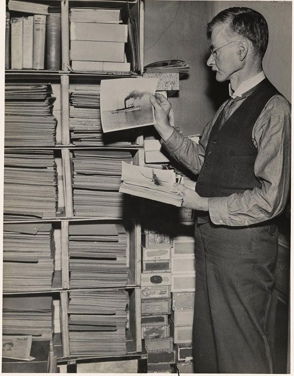 Once retired, Herman was able to devote all his time to collecting marine lore. As a railroad employee he was able to ride the trains free of charge. Each year he made an annual tour of all principal lake ports, visited with officials, captains and lake seamen. He spent hours going over old government records in the marine custom houses transcribing their information into his records. At the same time he kept up a heavy correspondence with other collectors, marine photographers, government agencies and shipping lines.