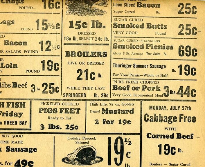 All records kept by Herman were in his own handwriting – a handwriting which needs some effort to decipher. He was a frugal man and his records were mainly written on the backs of coupon flyers (which are very interesting themselves, and yes that is chopped beef 3 lbs. for 44 cents and ready to eat Pigs Feet 3 lbs. for 25 cents and, just in time for St. Patrick’s Day, cabbage free with corned beef for 19 cents a pound), church bulletins, envelop backs, and old photos (non-marine of course).
