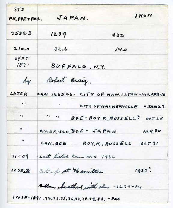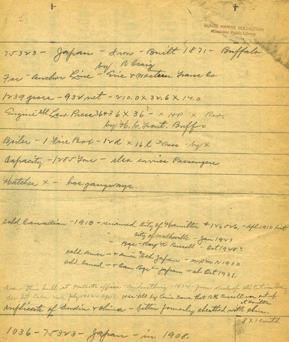 Once at the library, these records were transcribed and typed, by manual typewriter, onto data sheets of a sturdier card stock. His handwritten index cards, written on the back of photos, are still available to researchers but most of the information is now incorporated into the vessel files. The press release stated the highlights of the collection contained information on more than 85,000 ships, photos on more than 17,000 lake ships and index cards on more than 35,000 vessels.