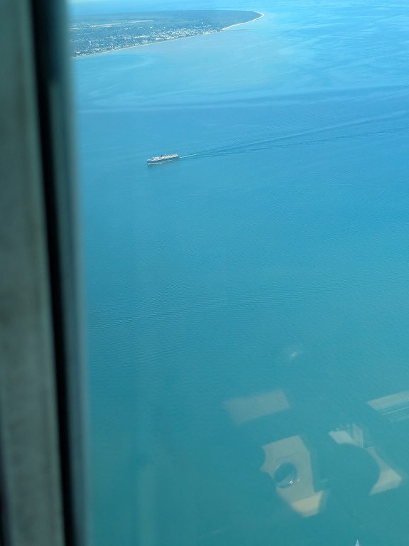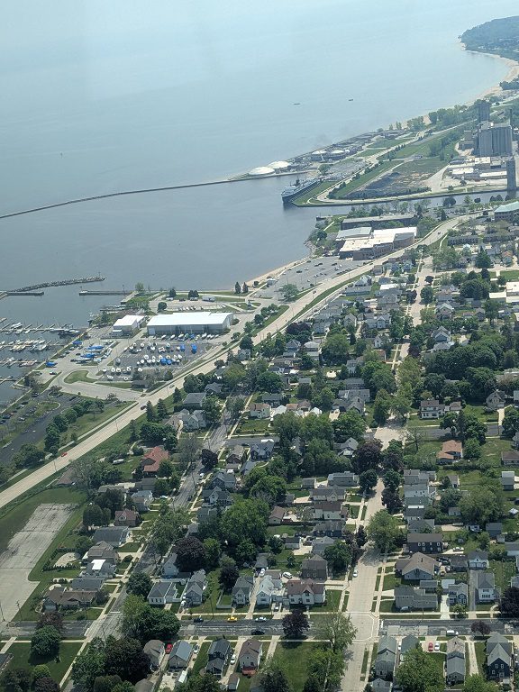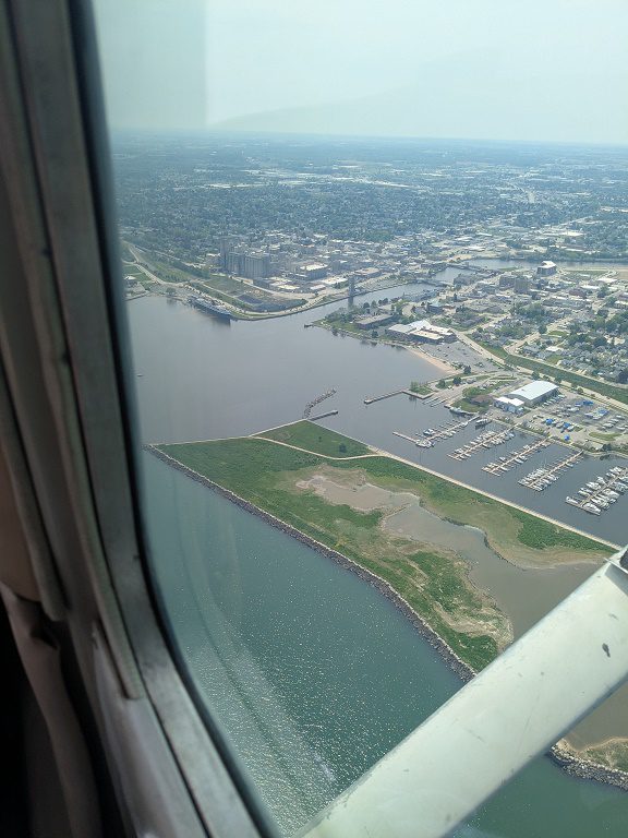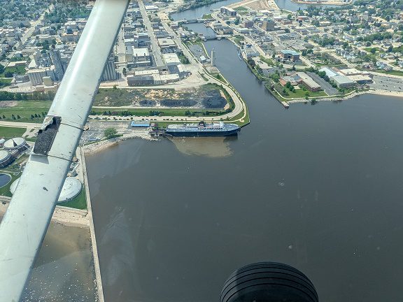 As my bio states, I fly a Cessna 172.  Recently, while flying my plane over Manitowoc, Wis., I saw the legendary car ferry BADGER as she was arriving at Manitowoc and docking. You can see the mud stirred up by the ship as she maneuvered herself into the dock.
