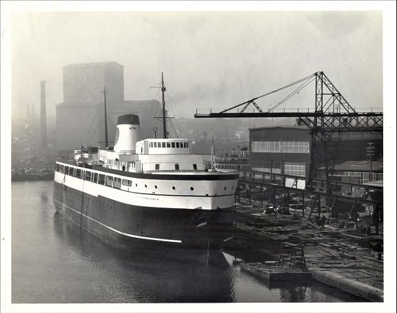 In 1939 the Manitowoc Shipbuilding Co. received the contract for a new streamlined $1,970,000 carferry. It was to have an increased capacity on the main deck to load 34 standard size freight cars on four railroad tracks. Some of the requirements were the cabin deck was to have separate smoking parlors for men and women, 62 of the 74 passenger staterooms, and a dining room that could accommodate 57 people in one sitting. The new feature was carrying 50 automobiles on the upper deck, instead of the main deck.