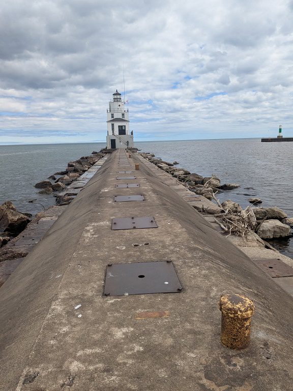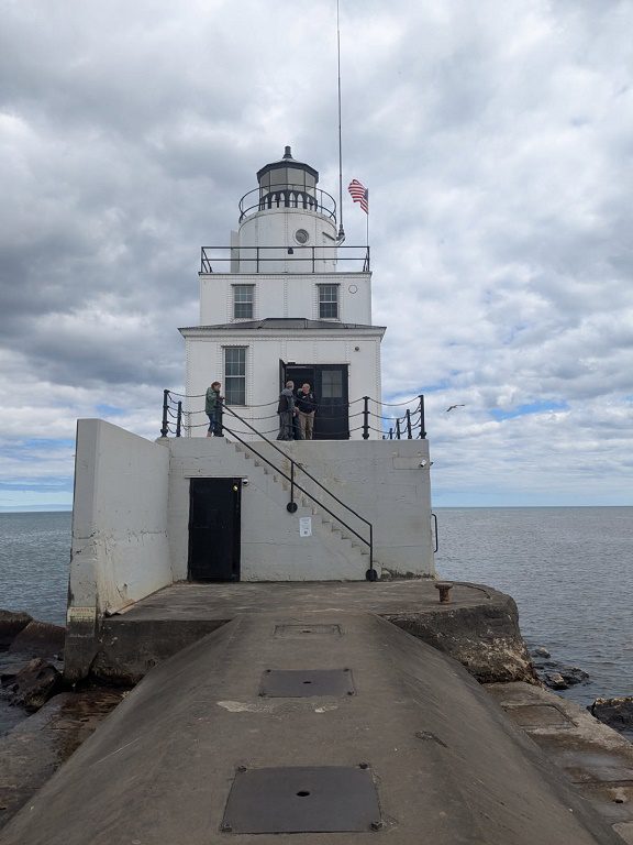 The lighthouse at the end of the breakwater at the entrance to Manitowoc harbor has recently opened for tours. I took the first tour of it with Wisconsin Maritime Museum staffer Lizzy Farrey-Luerssen and Dennis Huckens of the Manitowoc Sunrise Rotary. The public is welcome to walk out for pictures as well.