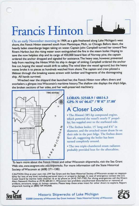 In October of 1988, divers Randy “Roughwater” Wallander and Dan Hildebrand discovered the HINTON’s remains between Manitowoc and Two Rivers.