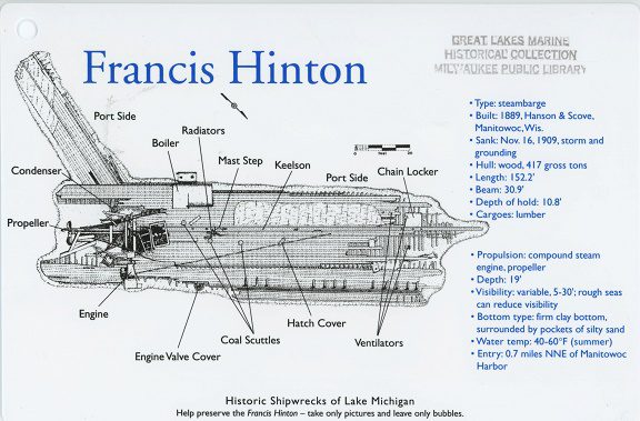 The FRANCIS HINTON was built at the Hanson & Scove shipyard of Manitowoc in 1889.  Built for Truman & Cooper of Manitowoc at a cost of $35,000 she measured 152.2 feet in length, 30.9 feet in beam and 10.8 in depth.  She was in the Lake Michigan lumber trade.