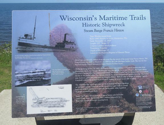 “During the severe storm Tuesday, the steamer FRANCIS HINTON, went ashore three miles south of Two Rivers.  About eight o’clock in the morning, when the storm was about at its height, the barge rounded Twin River Point and began heading in, until abreast of the harbor at Two Rivers, when for some reason the course was again changed out into the lake.  An hour later, the steamer was fast aground and huge waves were washing over her.  The crew managed to reach shore in the yawl boat, after battling with the waves for nearly an hour.  The lookout at the Two Rivers Life Saving Station, saw the plight of the distressed steamer and loading the life boat on the truck, hauled by a double span of horses and also taking the shore apparatus with the, proceeded to the scene of the wreck.  Mountainous seas greeted the life saver.  However, undaunted, they launched their boat and sometimes on the crews of a wave, then again buried in the depths of the angry seas, they managed to row to the disabled steamer.  Not a sign of life was found on the deserted boat and the life savers returned to the shore, where hundreds of willing hands, who had proceeded to the wreck by the Interurban cars, from both Two Rivers and Manitowoc, assisted in bringing the life boat back to the shore.