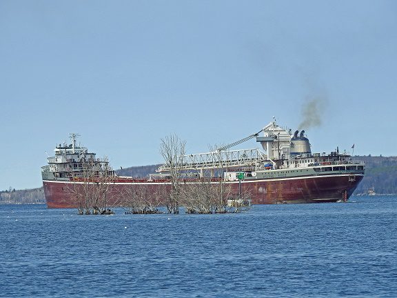 Look for a forward pilot house, an aft self-unloading boom with an iron ore red hull and white and gray upper paint.